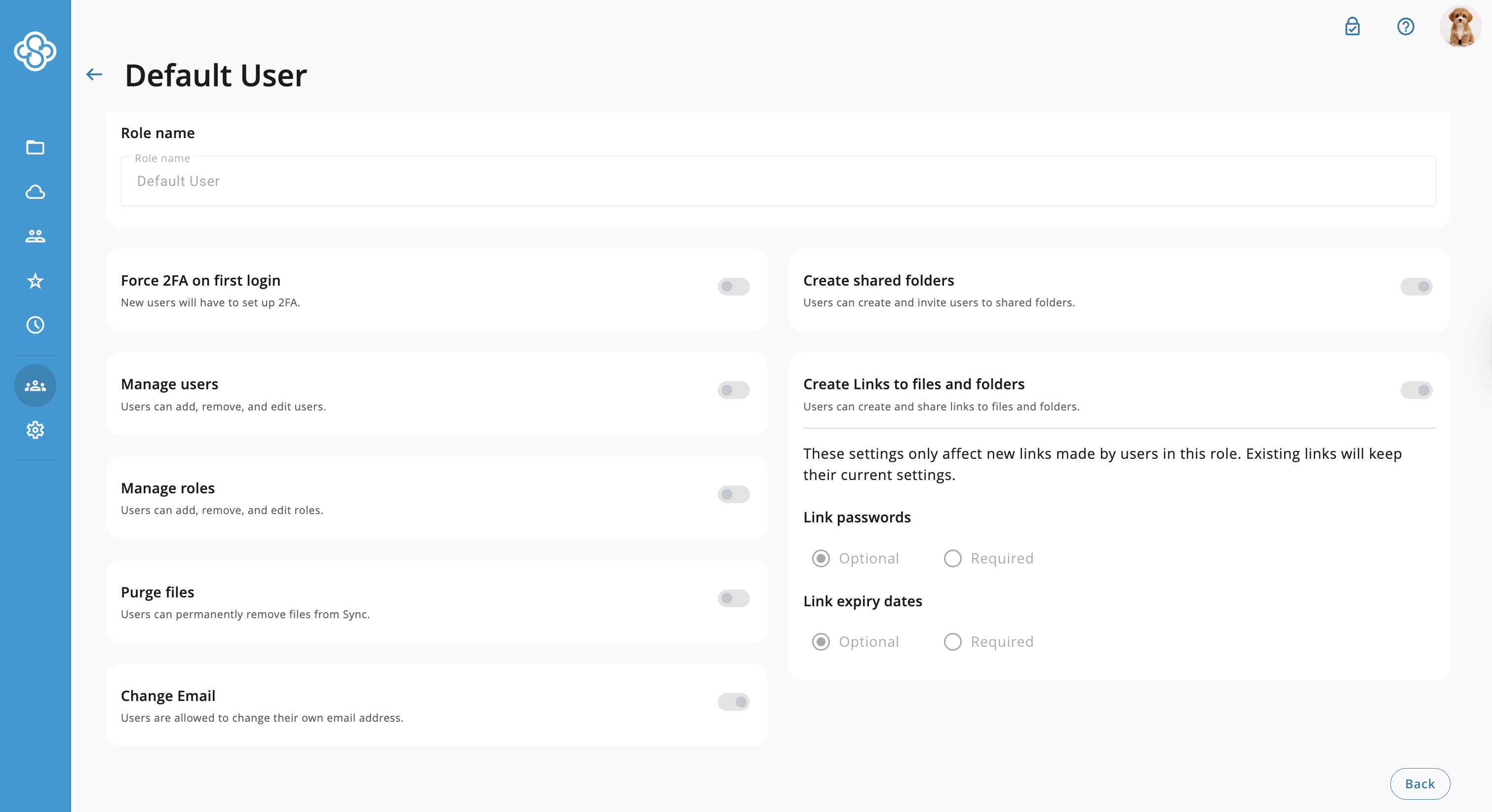 - Use role-based access controls (RBAC) to control which Sync features are available to your users, enforce 2FA company-wide, and restrict permanent file deletion (purge).